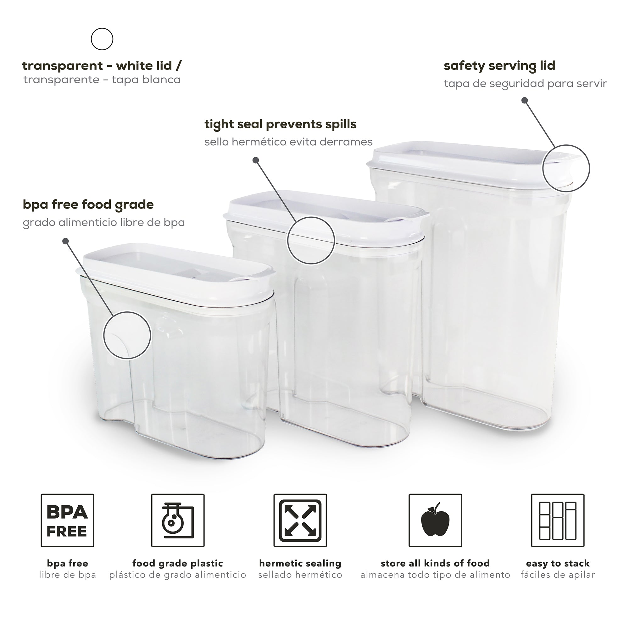Thanks to their stackable design and three different sizes, you can optimize space in your pantry or refrigerator and keep every ingredient within reach. They are microwave, dishwasher, and refrigerator safe, making your daily routine easier and adapting to any need. Made with BPA-free materials and an ergonomic grip, these cereal containers not only take care of your health, but also add a modern and sophisticated touch to your kitchen. Make the leap to smart organization and enjoy the peace of mind of having your food always fresh, ready, and safe.